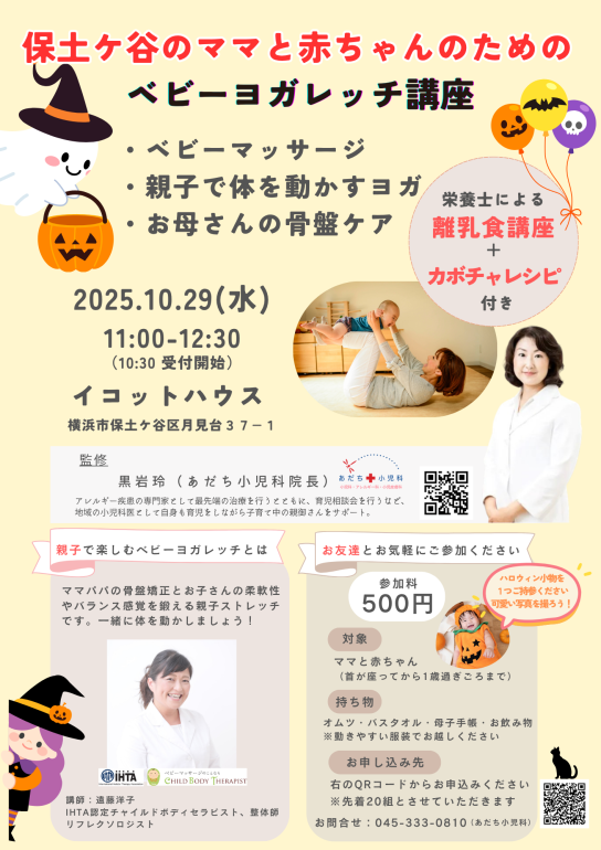 あだち小児科 黒岩先生監修、ハロウィン特別企画ベビーヨガレッチ講座を開催